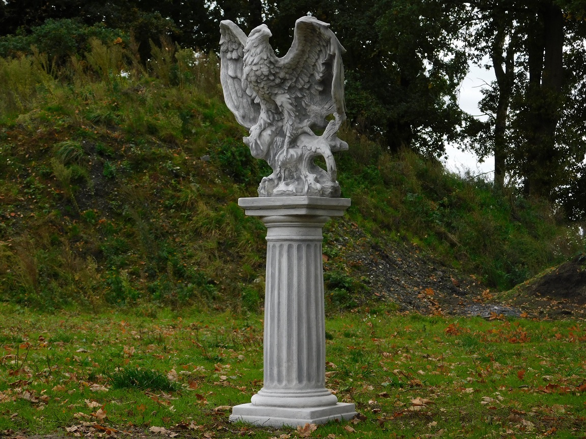 De adelaar rust op een klassieke, bijpassende stenen zuil, wat zorgt voor extra hoogte en een statige uitstraling.